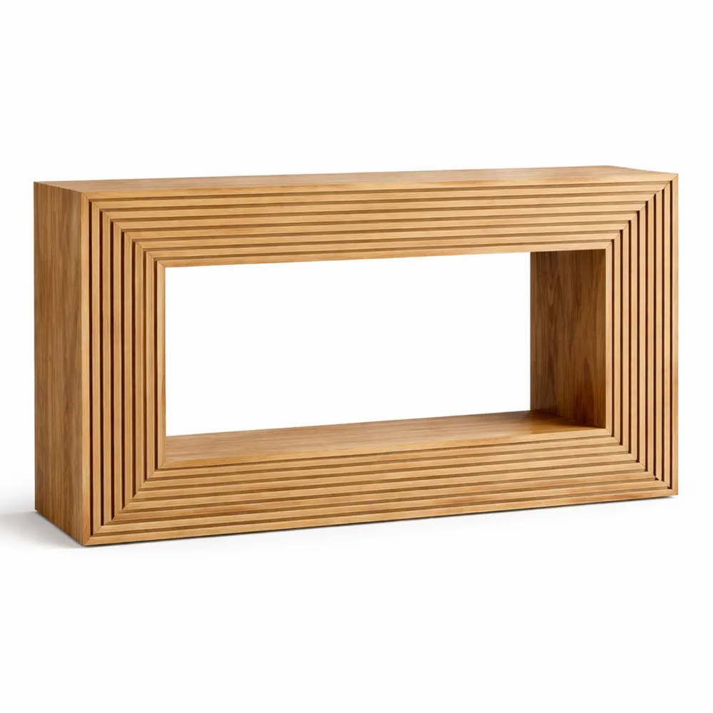 Il tavolino consolle in legno presenta una venatura naturale e linee rettangolari pulite. Il design goffrato sul davanti combina modernità con il fascino rustico di una casa di campagna, aggiungendo carattere al vostro spazio.